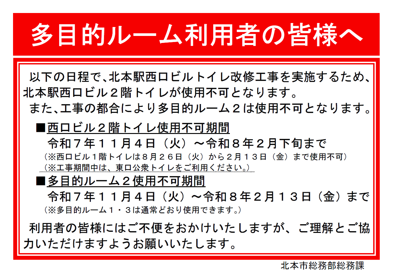 ※上に掲載したお知らせのとおり、西口ビルトイレ改修工事の関係で、令和7年11月4日~令和8年2月13日の期間中、多目的ルーム2が使用不可となります。ご理解のほどよろしくお願いいたします